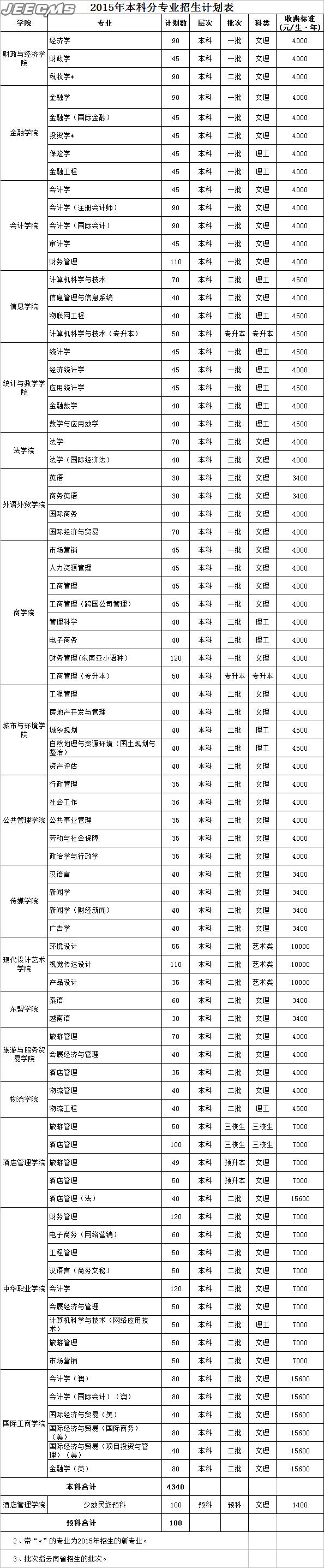 云南財經(jīng)大學2015年普高分類別專業(yè)招生計劃表