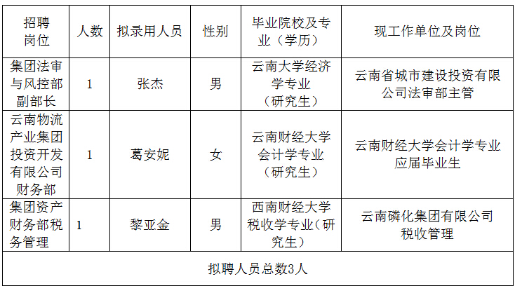云南物流產(chǎn)業(yè)集團2015年度公開招聘擬錄用人員公示