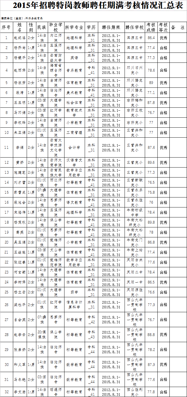 2015年招聘洱源縣特崗教師聘任期滿考核情況匯總表