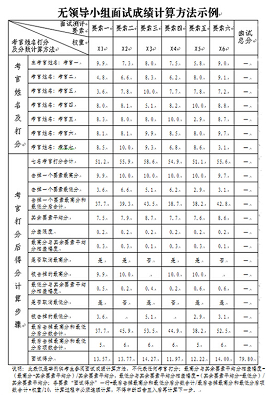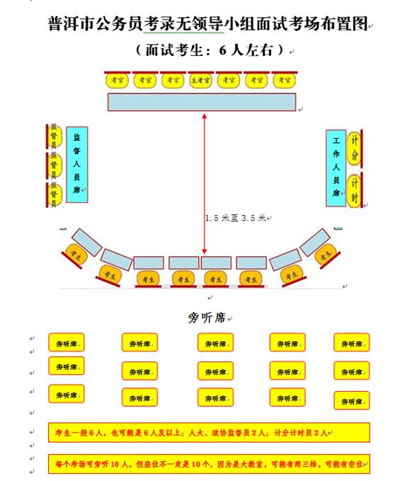 (3)每個面試考場人員安排為考官7人(主考官1人,其他考官6人,面試考場成立面試考官小組,主考官為面試考官小組組長),計(jì)分2人,引導(dǎo)員1人,人大監(jiān)督員1人,政協(xié)監(jiān)督員1人,考生一般每個考場每輪8人左右,設(shè)旁聽席位10個。
