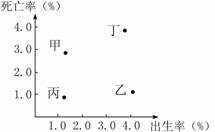21.圖4表示甲、乙、丙、丁四個(gè)國(guó)家的人口出生率與死亡率。其中反映人口高出生率、低死亡率、高自然增長(zhǎng)率特點(diǎn)的國(guó)家是