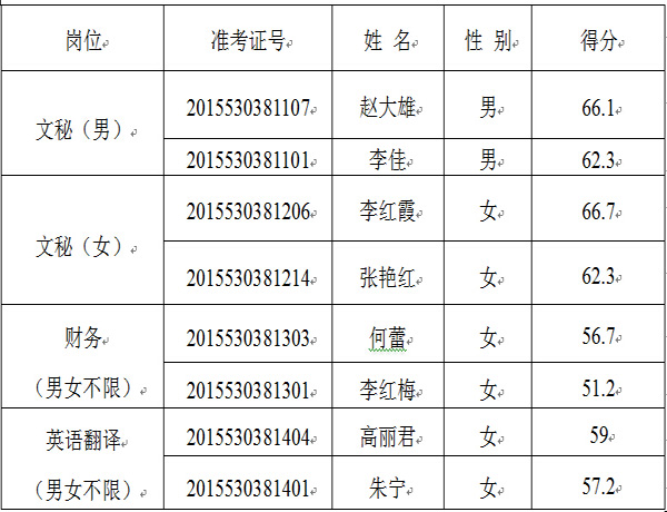 根據(jù)《宣威市招商合作局公開選調(diào)工作人員實(shí)施方案》,本次公開考試選調(diào)崗位分別為:文秘崗位,選調(diào)2人(男女各1名);財務(wù)崗位,選調(diào)1人(男女不限);英語翻譯崗位,選調(diào)1人(男女不限);企業(yè)服務(wù)和招商引資崗位,選調(diào)4人(男女各2名),本崗位因報名人數(shù)未能達(dá)到開考比例被取消。按照筆試成績從高分到低分的順序,分崗位、分男女比例分別按照1:2的比例確定各個崗位的面試人員的規(guī)定,現(xiàn)將宣威市招商合作局公開選調(diào)工作人員進(jìn)入面試人員名單公告如下。