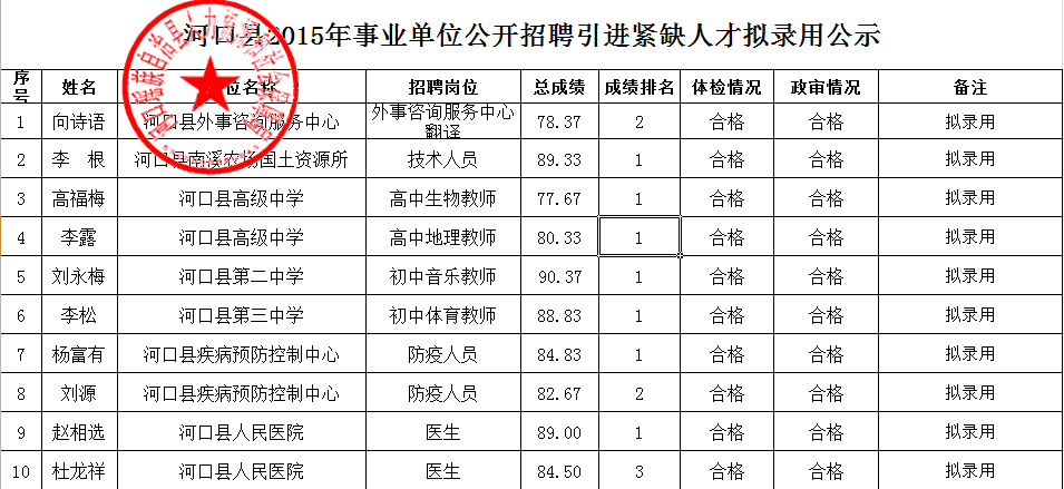 河口縣2015年事業(yè)單位公開招聘引進緊缺人才擬錄用人員公示