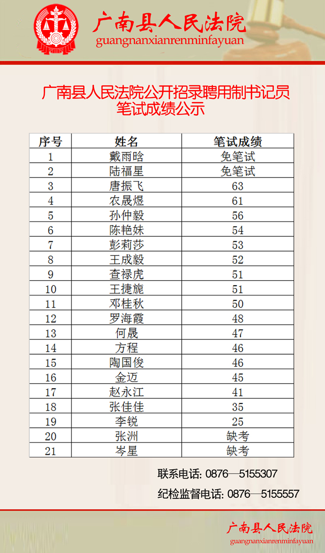 廣南縣人民法院2015年招錄聘用制書記員筆試成績公示