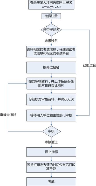 網(wǎng)絡(luò)報(bào)名的大致流程為:登錄玉溪人才網(wǎng)→網(wǎng)上報(bào)名入口→注冊(cè)→查看招聘崗位→按崗位報(bào)名并填寫報(bào)名資料→等待審核→審核通過(guò)→網(wǎng)上交費(fèi)(注意查看交費(fèi)狀態(tài),確認(rèn)交費(fèi)成功)→打印筆試準(zhǔn)考證(打印時(shí)間在筆試公告內(nèi)另行通知)→參加筆試。