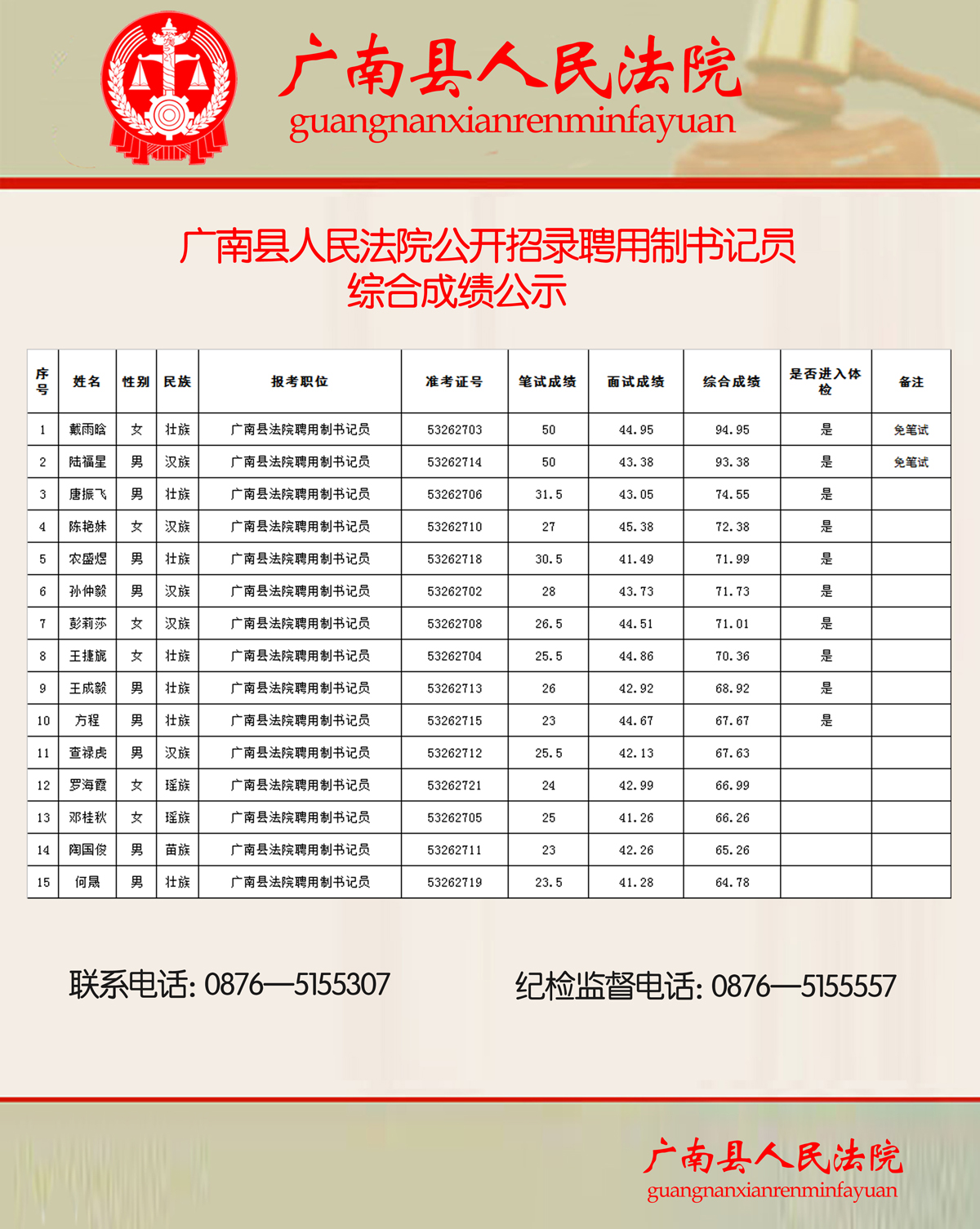 廣南縣人民法院2015年招錄聘用制書(shū)記員綜合公示
