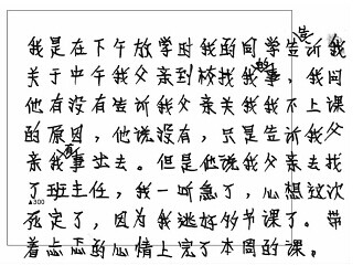 ●采用網(wǎng)上評(píng)卷,考生的答題卡經(jīng)掃描后,每個(gè)小題以答題區(qū)域框?yàn)榻?,被切割成一個(gè)個(gè)獨(dú)立的圖象,評(píng)卷教師只能看到分配給該教師的答題區(qū)域以內(nèi)的部分。如果不在規(guī)定的題號(hào)區(qū)域內(nèi)答題,例如將21題答在其它題的答題區(qū)域,則評(píng)閱21題的評(píng)卷教師將看不到21題的答題情況,導(dǎo)致該題得分為零。如果書(shū)寫(xiě)答案超過(guò)該區(qū)域,則掃描設(shè)備掃描時(shí)無(wú)法將超出規(guī)定答題區(qū)外的書(shū)寫(xiě)答案加以掃描,這樣,評(píng)卷教師所看到的考生答題圖象是不完整的,勢(shì)必會(huì)影響評(píng)卷成績(jī)。比如: