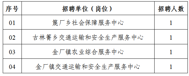 2015年我縣鄉(xiāng)鎮(zhèn)事業(yè)單位面向全省統(tǒng)一選聘、在我縣任滿(mǎn)兩個(gè)聘期的大學(xué)生村官招聘4名工作人員,具體崗位如下: