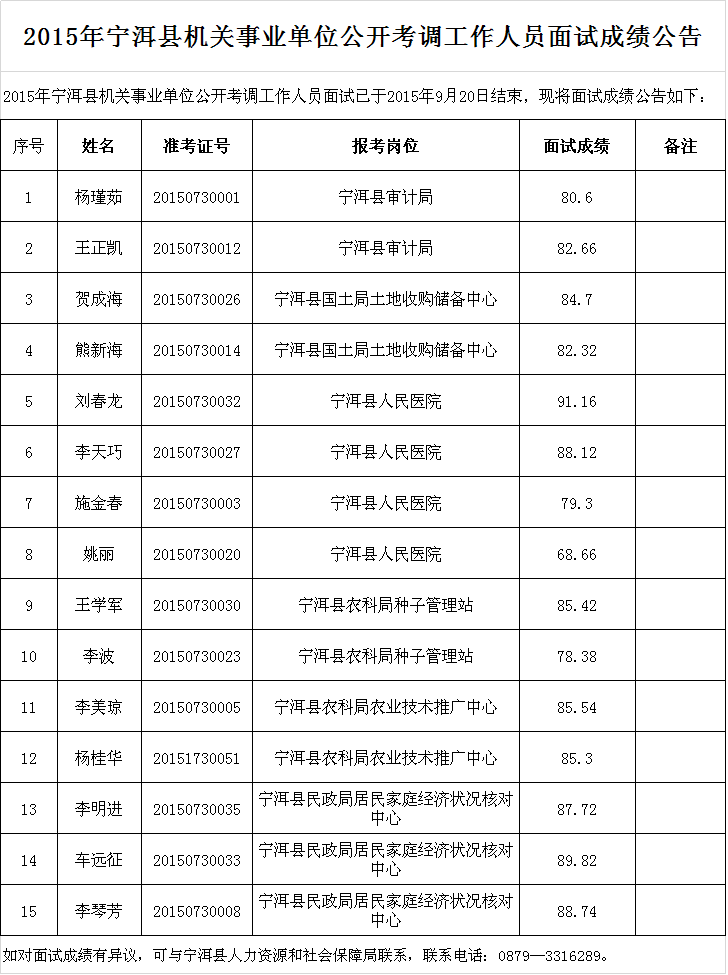 2015年普洱市寧洱縣機(jī)關(guān)事業(yè)單位考調(diào)人員面試成績(jī)公告