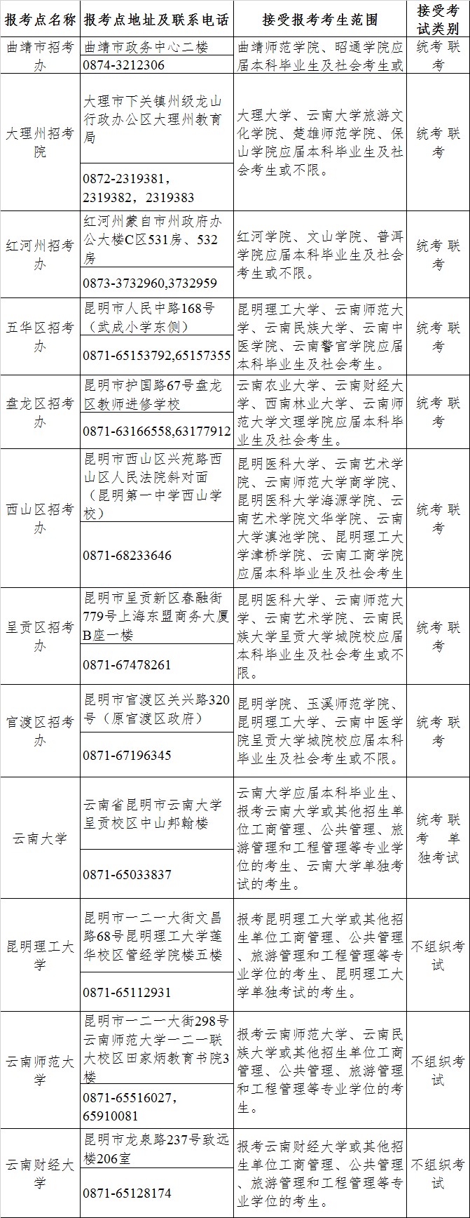 2016年云南省各報(bào)考點(diǎn)接受報(bào)考考生范圍及考試類別