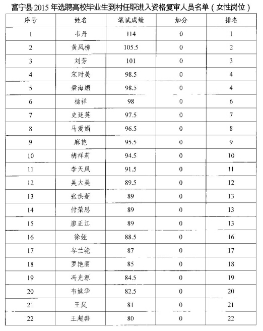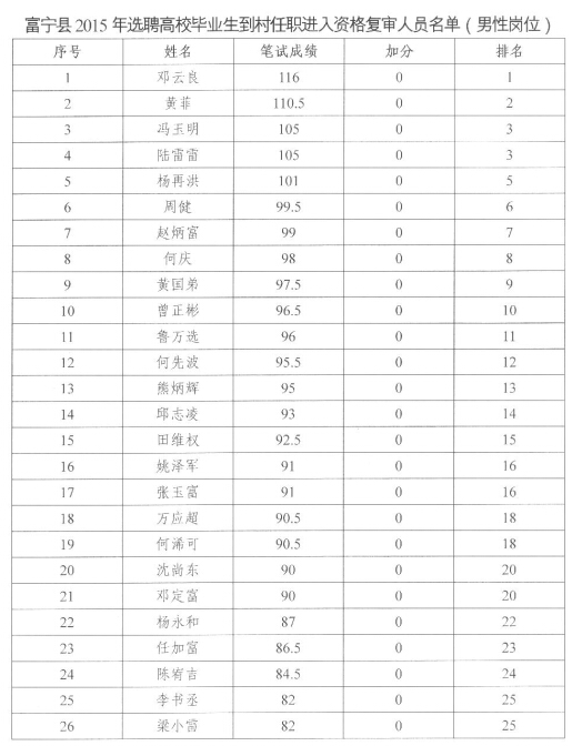 富寧縣2015年計劃選聘大學生村官32名(其中:男16名,女16名),根據(jù)筆試成績(含加分成績),按照省委組織部確定報考我縣大學生村官崗位的進入資格復(fù)審人員有48名,其中男性崗位26名、女性崗位22名,具體名單分別附后。