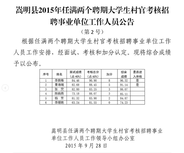 嵩明縣2015年任滿兩個(gè)聘期村官招聘事業(yè)單位人員綜合成績公告