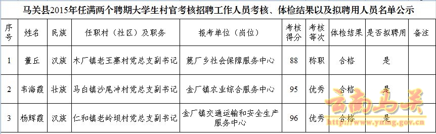 附:馬關(guān)縣2015年任滿兩個(gè)聘期大學(xué)生村官考核招聘工作人員考核、體檢結(jié)果以及擬聘用人員名單