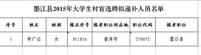 根據(jù)《云南省2015年大學生村官選聘公告》和省委組織部《關(guān)于做好2015年大學生村官選聘工作的通知》(云組發(fā)電〔2015〕11號)、《關(guān)于做好2015年云南省大學生村官選聘面試工作的通知》要求,現(xiàn)將墨江縣2015年大學生村官選聘擬遞補人員名單予以公示。公示時間為2015年10月30日至11月3日。公示期間,如對公示對象有意見,請向縣委組織部、縣人力資源和社會保障局反映。