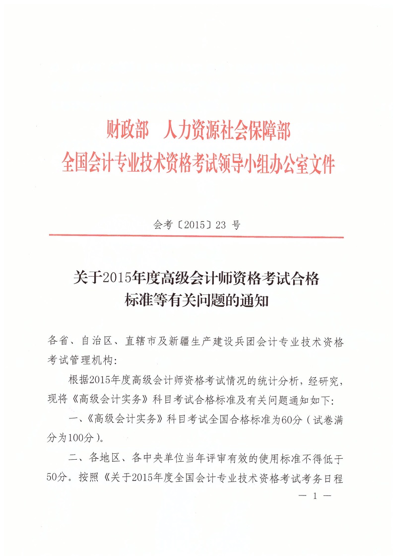 2015年度高級(jí)會(huì)計(jì)師資格考試合格標(biāo)準(zhǔn)通知