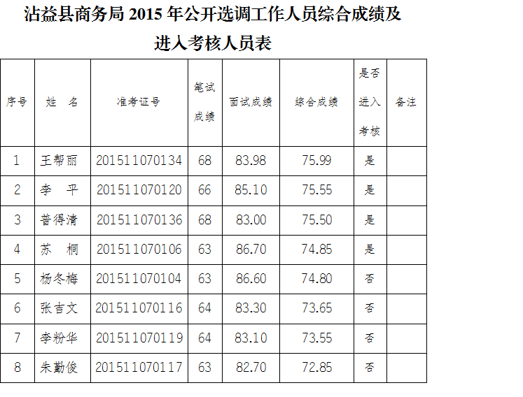 根據(jù)沾益縣商務(wù)局2015年公開選調(diào)工作人員實(shí)施方案的要求,沾益縣商務(wù)局2015年公開選調(diào)工作人員面試工作于11月17日結(jié)束,現(xiàn)將考生綜合成績(jī)及進(jìn)入考核人員公告如下: