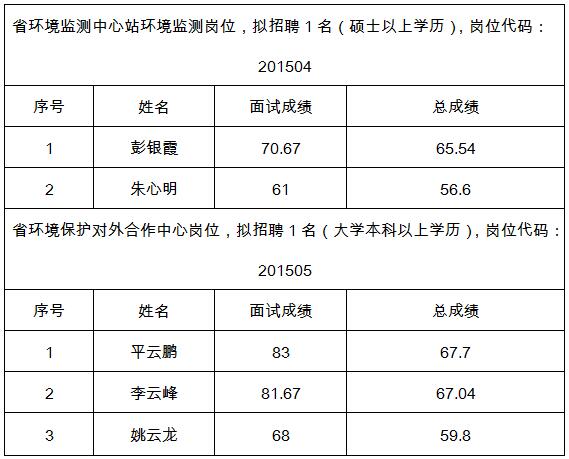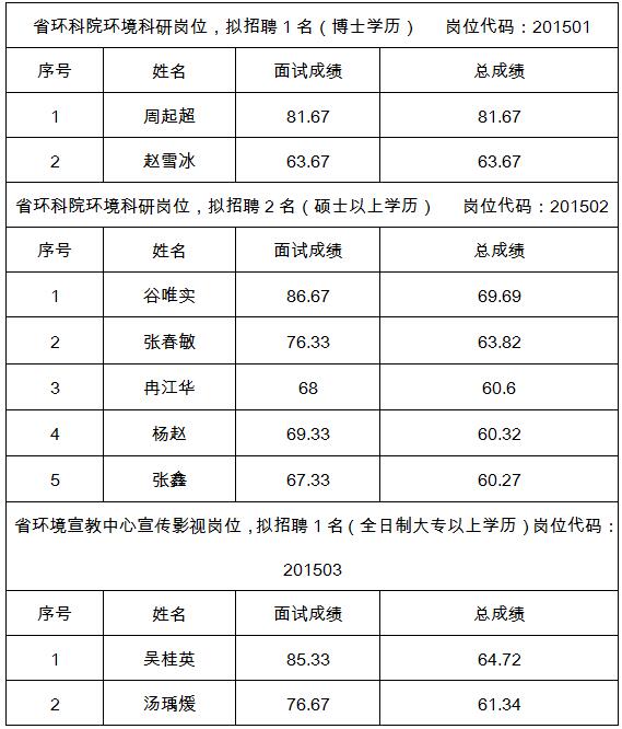 現(xiàn)將省環(huán)境保護(hù)廳直屬事業(yè)單位2015年公開招聘工作人員面試成績(jī)及總成績(jī)公示如下: