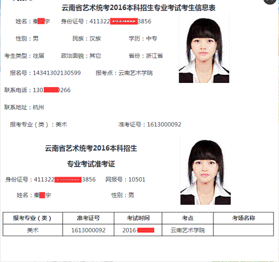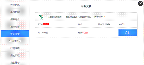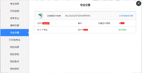 本說(shuō)明所列舉圖片顯示的數(shù)據(jù)(如考生信息、考試時(shí)間、收費(fèi)標(biāo)準(zhǔn)等)均為測(cè)試之用,準(zhǔn)確信息以云南省招生考試院相關(guān)文件規(guī)定、云南藝術(shù)學(xué)院2016年云南省招生簡(jiǎn)章及網(wǎng)上公布的信息為準(zhǔn)。