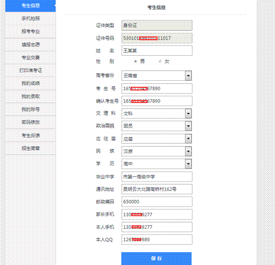 登錄成功后,系統(tǒng)會(huì)自動(dòng)轉(zhuǎn)到基本信息填寫界面,考生需要如實(shí)填寫自己的基本信息,填寫完畢后保存信息。如下圖所示: