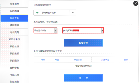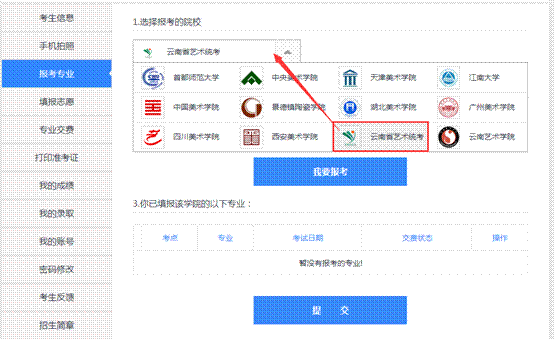 第一步選擇“報(bào)考院校”:省統(tǒng)考選擇“云南省藝術(shù)統(tǒng)考”,非統(tǒng)考(云南藝術(shù)學(xué)院校考)選擇“云南藝術(shù)學(xué)院”;