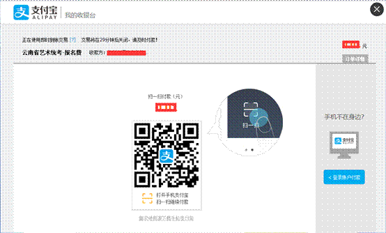 提交成功后進(jìn)入“專業(yè)交費(fèi)”頁(yè)面,點(diǎn)擊“支付”按鈕,系統(tǒng)會(huì)打開(kāi)支付寶支付頁(yè)面,考生在支付寶平臺(tái)交費(fèi)成功后,調(diào)回到“藝考報(bào)名交費(fèi)平臺(tái)”后會(huì)顯示“支付成功”。