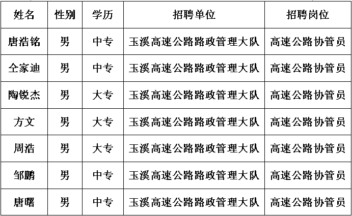 玉溪高速公路路政管理大隊(duì)面試人員名單公示如下: