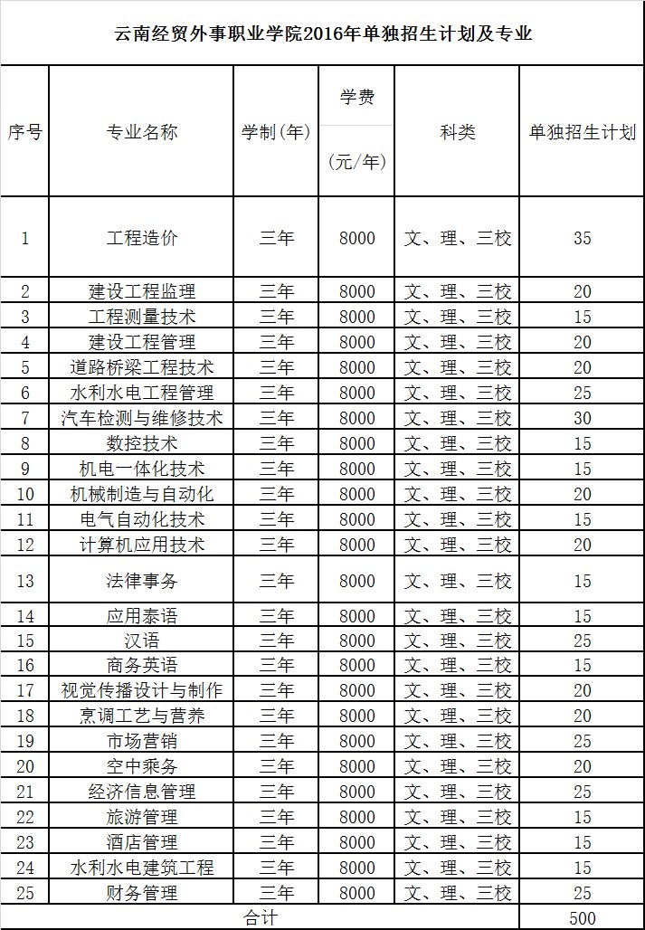 單獨招生錄取工作在云南省招生考試院指導、監(jiān)督下,由云南經(jīng)貿(mào)外事職業(yè)學院按照“公平、公正、公開、綜合評價、全面考核、擇優(yōu)錄取”的原則進行錄取。