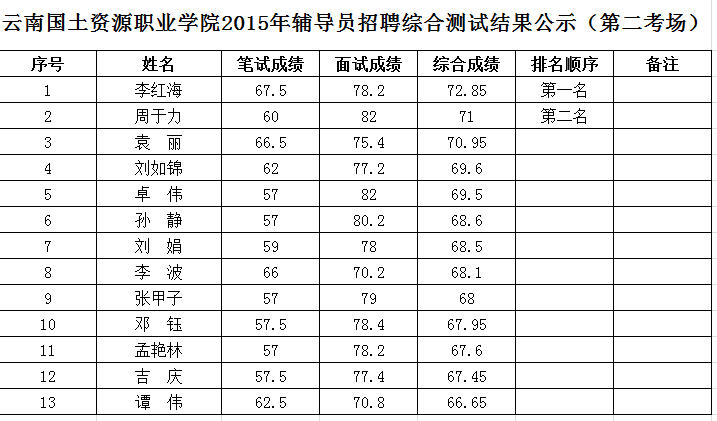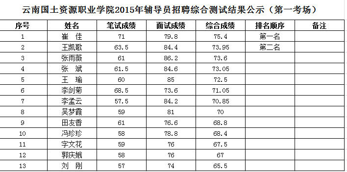 根據(jù)云南國土資源職業(yè)學(xué)院2015年專職輔導(dǎo)員招聘啟事及補(bǔ)充公告,通過筆試、心理測試和分組面試(現(xiàn)場抽簽)三個(gè)環(huán)節(jié)的考核,最終取每組的前兩名:崔佳、王凱歌(第一考場);李紅海、周于力(第二考場)為此次招聘擬聘用人選,現(xiàn)將結(jié)果公示如下,公示期為七天(2015年12月27日-2016年1月2日),公示期內(nèi)如對結(jié)果有異議,請向?qū)W校監(jiān)審處反映,監(jiān)督電話為:0871-68160980。