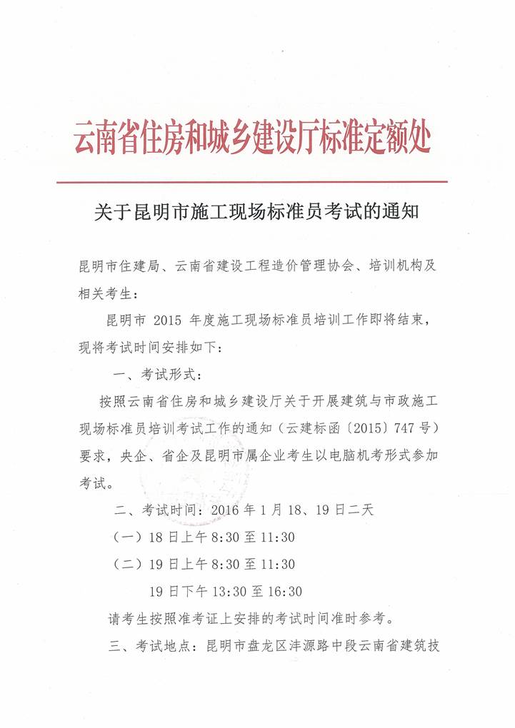 2015年昆明市施工現(xiàn)場標(biāo)準(zhǔn)員考試通知