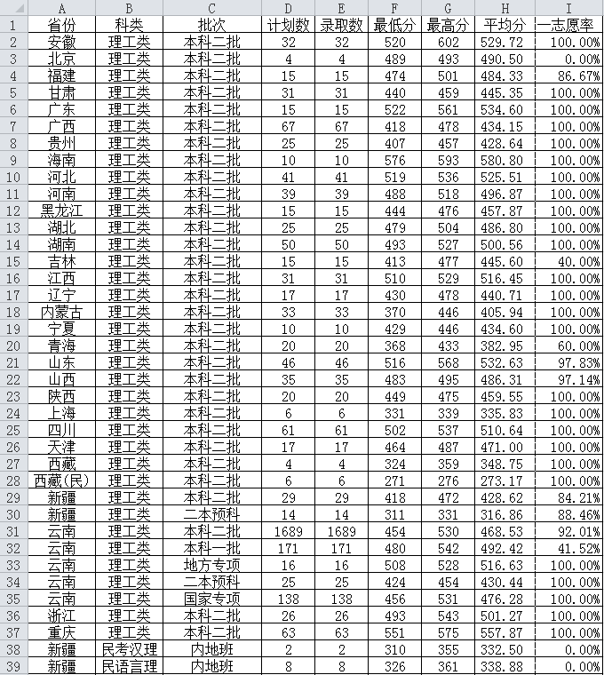 西南林業(yè)大學(xué)2015年全國(guó)各省份理工類錄取情況表