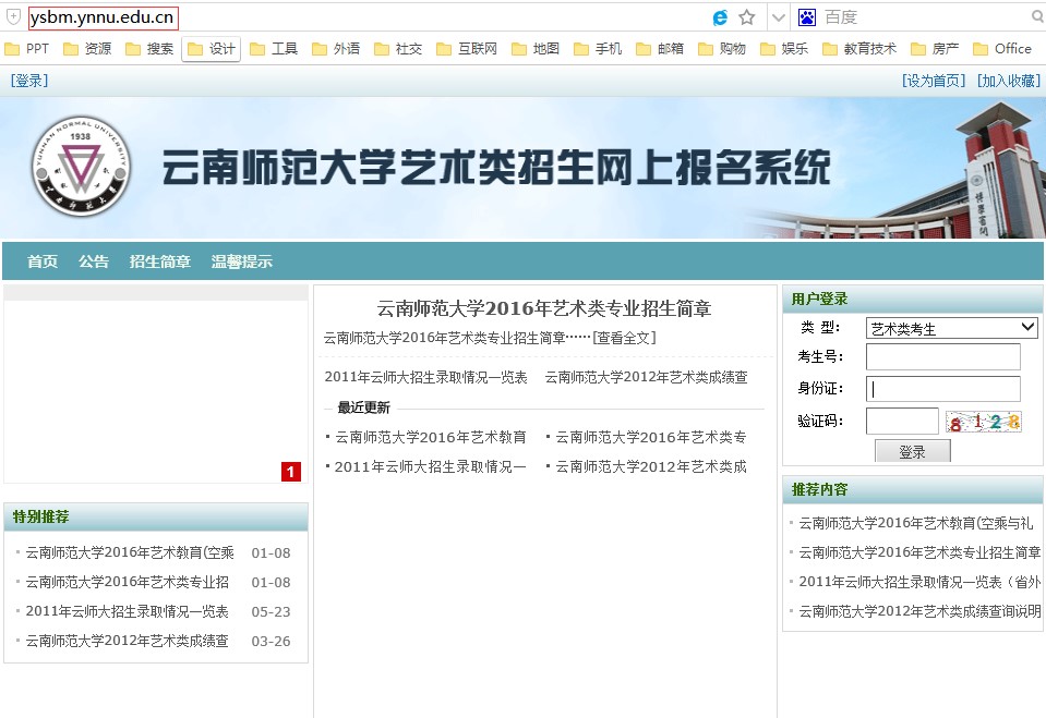 打開瀏覽器,在瀏覽器地址欄輸入:ysbm.ynnu.edu.cn,按enter鍵進(jìn)入系統(tǒng)。建議使用IE9及以上版本瀏覽器或360極速瀏覽器,有兼容和極速模式的瀏覽器,使用兼容模式打印準(zhǔn)考證。