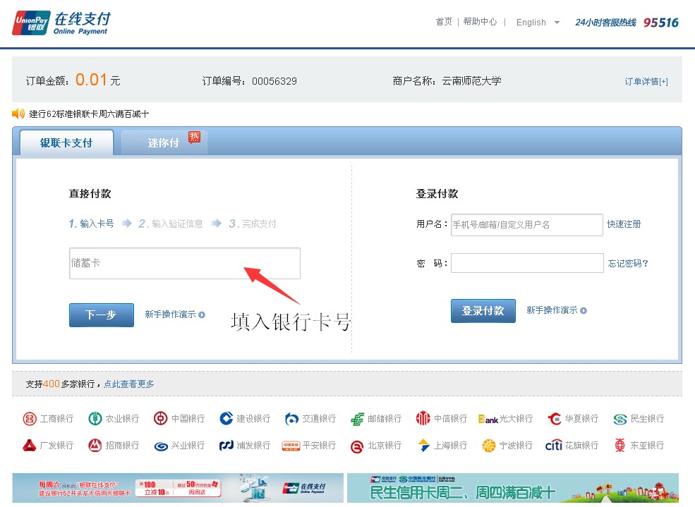 4.跳轉(zhuǎn)到“銀聯(lián)在線支付”頁面,輸入銀行卡號后點(diǎn)擊“下一步”。