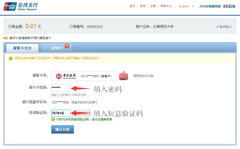 5.根據(jù)提示分別在對應(yīng)的框內(nèi)輸入“銀行卡密碼”和手機(jī)短信接收到的“驗(yàn)證碼”,確認(rèn)無誤后點(diǎn)擊“確認(rèn)付款”