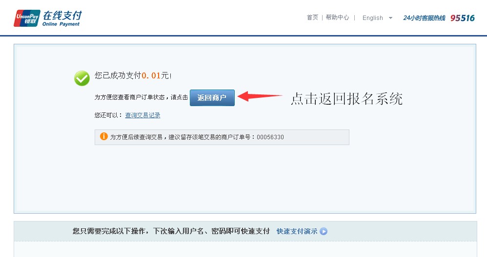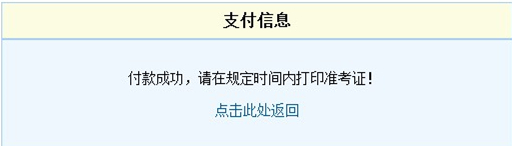 6.支付成功后,點(diǎn)擊“返回商戶”,返回報(bào)名系統(tǒng)繼續(xù)考試報(bào)名的其他操作。