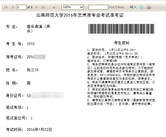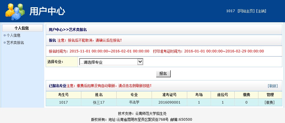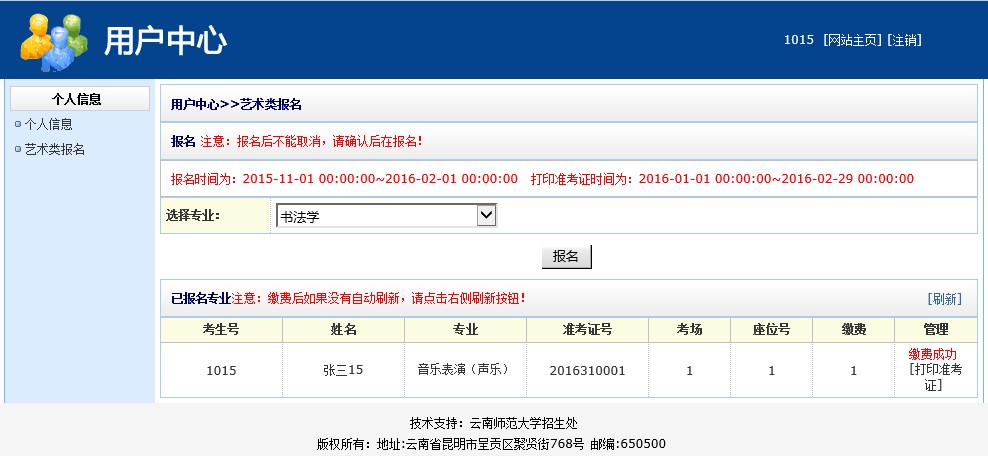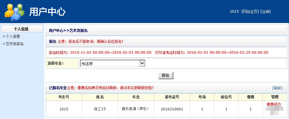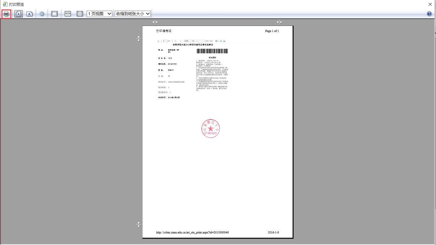 在2016年的1月20-21日,登錄該系統(tǒng),具體步驟與前面一致。點(diǎn)擊頁面中的“藝術(shù)類報(bào)名“按鈕。點(diǎn)擊“管理”欄下方的“打印準(zhǔn)考證”按鈕,即可跳出準(zhǔn)考證頁面,如圖17所示。