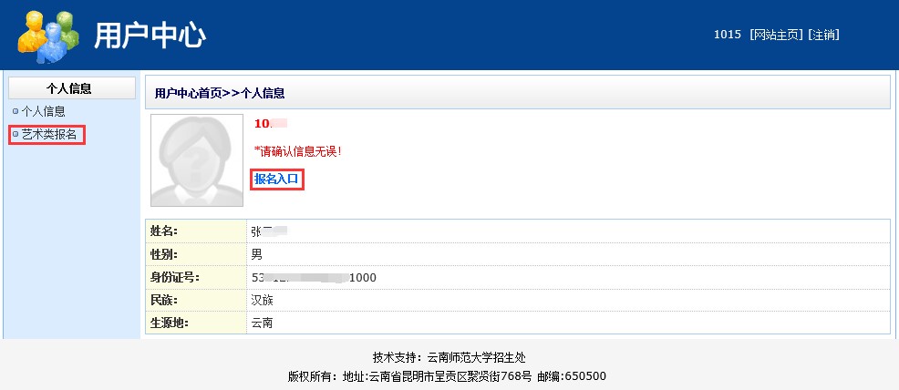 系統(tǒng)登錄后,會跳轉(zhuǎn)到后臺頁面,如圖3。仔細(xì)核對自己的個(gè)人信息,確認(rèn)無誤后,點(diǎn)擊“報(bào)名入口”或者“藝術(shù)類報(bào)名”進(jìn)入報(bào)名界面。