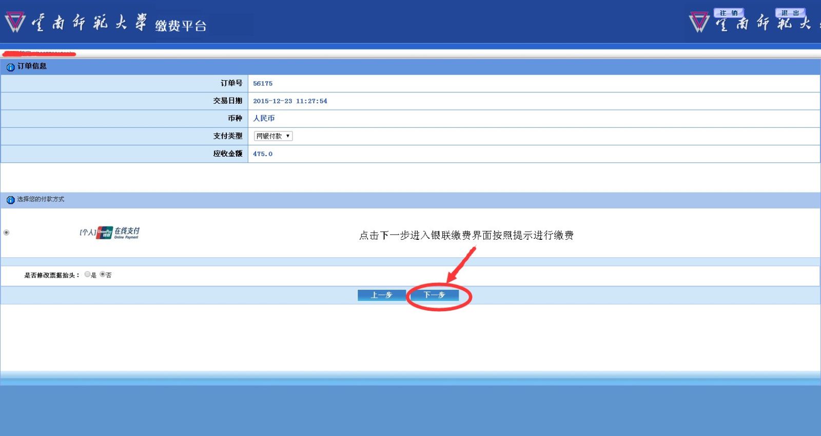 2.點(diǎn)擊頁面中的“繳費(fèi)”按鈕。即可跳轉(zhuǎn)到繳費(fèi)確認(rèn)頁面。核對信息無誤后點(diǎn)擊“下一步”確認(rèn)訂單。