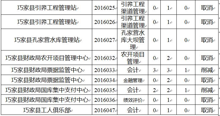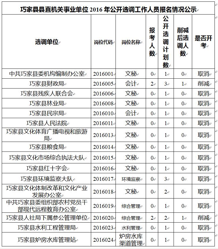 根據(jù)《巧家縣縣直機(jī)關(guān)事業(yè)單位2016年公開(kāi)選調(diào)工作人員公告》(第一號(hào)),巧家縣縣直機(jī)關(guān)事業(yè)單位2016年公開(kāi)選調(diào)工作人員報(bào)名、資格審查及復(fù)審環(huán)節(jié)的工作已于2016年1月10日結(jié)束。根據(jù)報(bào)名情況現(xiàn)將公開(kāi)選調(diào)取消崗位和削減崗位情況公告如下: