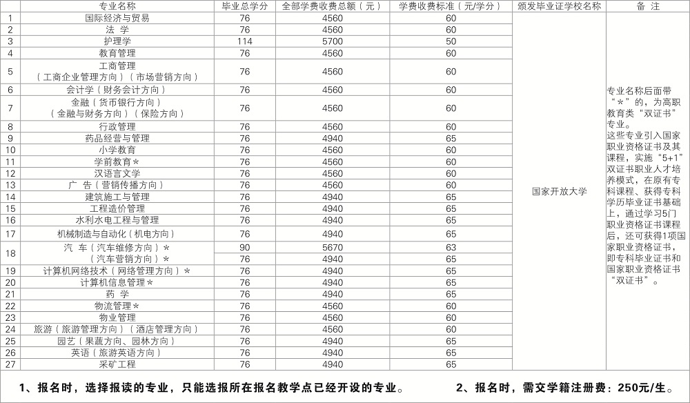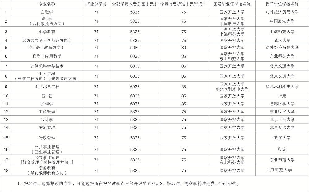 ☆報名手續(xù):報名時,須交驗(yàn)有效畢業(yè)證書原件;提交身份證和畢業(yè)證書復(fù)印件各1份,免冠數(shù)碼電子照片1份;填寫《國家開放大學(xué)開放教育學(xué)生報名登記表》和《入學(xué)資格承諾書》;交納學(xué)籍注冊建檔費(fèi)。其中: