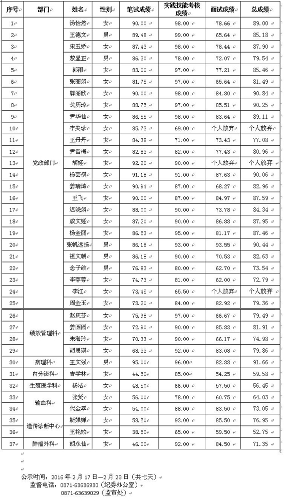 云南省第一人民醫(yī)院2016年編制外人員招聘成績(jī)公示