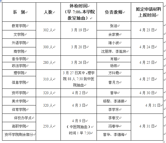 1、體檢時(shí)間安排:負(fù)責(zé)教師于當(dāng)日7:00在學(xué)校田徑場接醫(yī)生到本學(xué)院抽血地點(diǎn)。