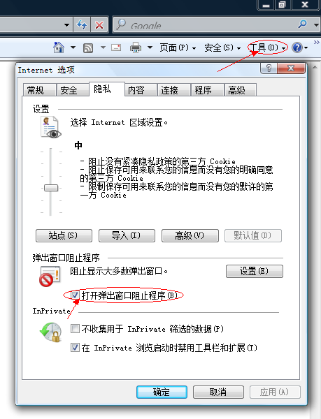 為了報名操作能夠順利進行,請使用IE瀏覽器(Internet Explorer)。調(diào)整瀏覽器屬性,關(guān)閉彈出窗口阻止程序:打開瀏覽器,在“工具”菜單的“Internet選項”中選擇“隱私”選項卡,將“打開彈出窗口阻止程序”前面的勾取消,然后點【應用】。