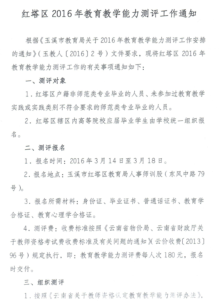 紅塔區(qū)2016年教育教學能力測評工作通知