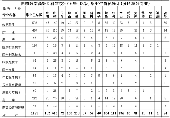 曲靖醫(yī)學(xué)高等專(zhuān)科學(xué)校2016屆共有畢業(yè)生1964人,大專(zhuān)畢業(yè)生1883人,中專(zhuān)畢業(yè)生81人,其中大專(zhuān)有12個(gè)專(zhuān)業(yè),分別是臨床醫(yī)學(xué)、護(hù)理學(xué)(含涉外護(hù)理方向、危重癥護(hù)理方向)、助產(chǎn)、醫(yī)學(xué)檢驗(yàn)技術(shù)、醫(yī)學(xué)影像技術(shù)、眼視光技術(shù)、醫(yī)學(xué)文秘、口腔醫(yī)學(xué)技術(shù)、衛(wèi)生信息管理、康復(fù)治療技術(shù)、藥學(xué)、藥品經(jīng)營(yíng)與管理,2015年新增設(shè)針灸推拿專(zhuān)業(yè),中專(zhuān)為護(hù)理專(zhuān)業(yè);為做好2016屆畢業(yè)生就業(yè)工作,方便各單位與我校畢業(yè)生進(jìn)行雙向選擇,學(xué)校定于2016年4月25日在曲靖醫(yī)學(xué)高等專(zhuān)科學(xué)校綜合館舉辦“曲靖醫(yī)學(xué)高等專(zhuān)科學(xué)校2016屆大中專(zhuān)畢業(yè)生供需洽談會(huì)”,我校畢業(yè)生情況如下: