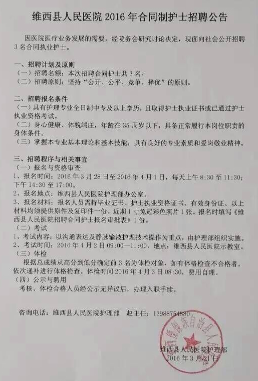 迪慶州維西縣人民醫(yī)院2016年合同制護士招聘公告
