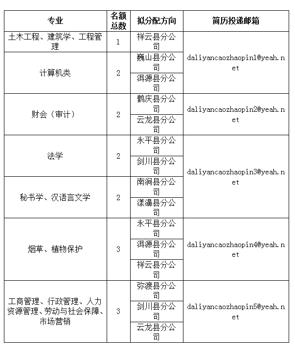 2.郵件標(biāo)題請(qǐng)注明學(xué)校、專(zhuān)業(yè)、學(xué)歷、姓名、性別、畢業(yè)時(shí)間,格式如“云南農(nóng)業(yè)大學(xué)/煙草栽培/本科/張某/男/2016年6月畢業(yè)”,請(qǐng)勿重復(fù)發(fā)送應(yīng)聘材料。