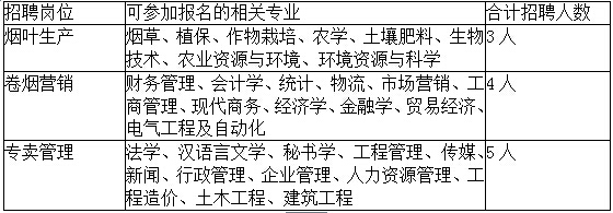 煙葉生產(chǎn)崗位3人、卷煙營(yíng)銷(xiāo)崗位4人、專(zhuān)賣(mài)管理崗位5人,合計(jì)招聘12人。