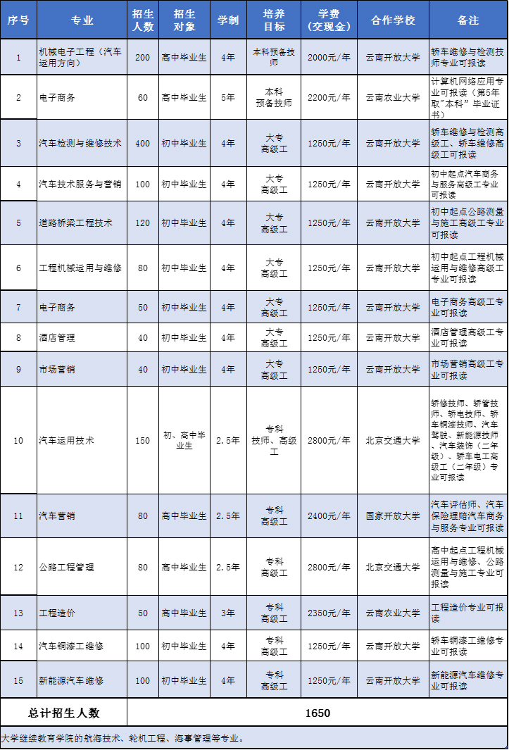 云南交通技師學院2016年繼續(xù)教育大專、本科招生計劃表