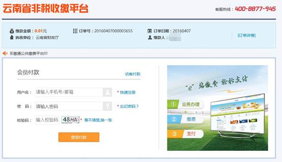 根據(jù)生成的訂單進(jìn)行支付,支付會(huì)跳轉(zhuǎn)到非稅收繳平臺(tái)。