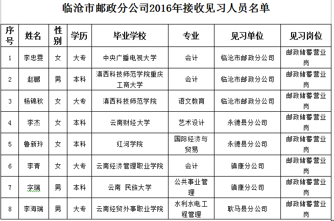 按照“公平、公正、公開”的原則臨滄市郵政分公司員工接收見習(xí)人員面試已結(jié)束,經(jīng)紀檢監(jiān)察審定,現(xiàn)將擬錄用情況進行公示如下: